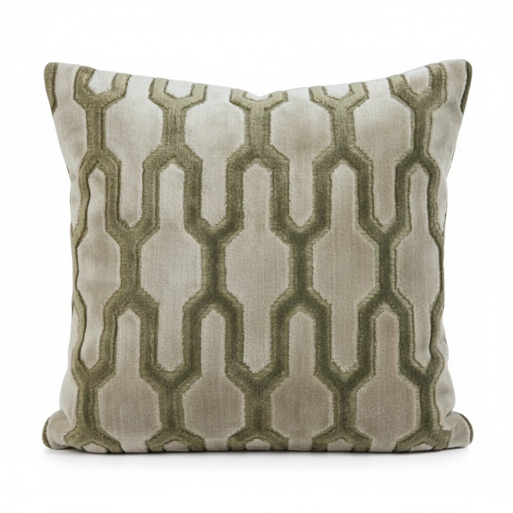 Breng warmte en textuur in huis met sierkussen JEMBANA van Light & Living. Dit vierkante kussen van 45x45 cm combineert een zachte zandkleurige basis met een opvallend olijfgroen patroon. De luxe mix van viscose en polyester geeft het een rijke glans en een zachte touch. Perfect voor op de bank, fauteuil of als accent op je bed.